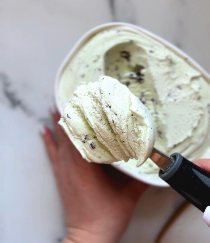 scooping mint ice cream for a copycat shamrock shake