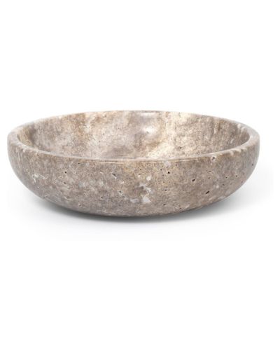 simple spring decor detail of pastel Easter eggs in a travertine bowl on a clean marble dining table